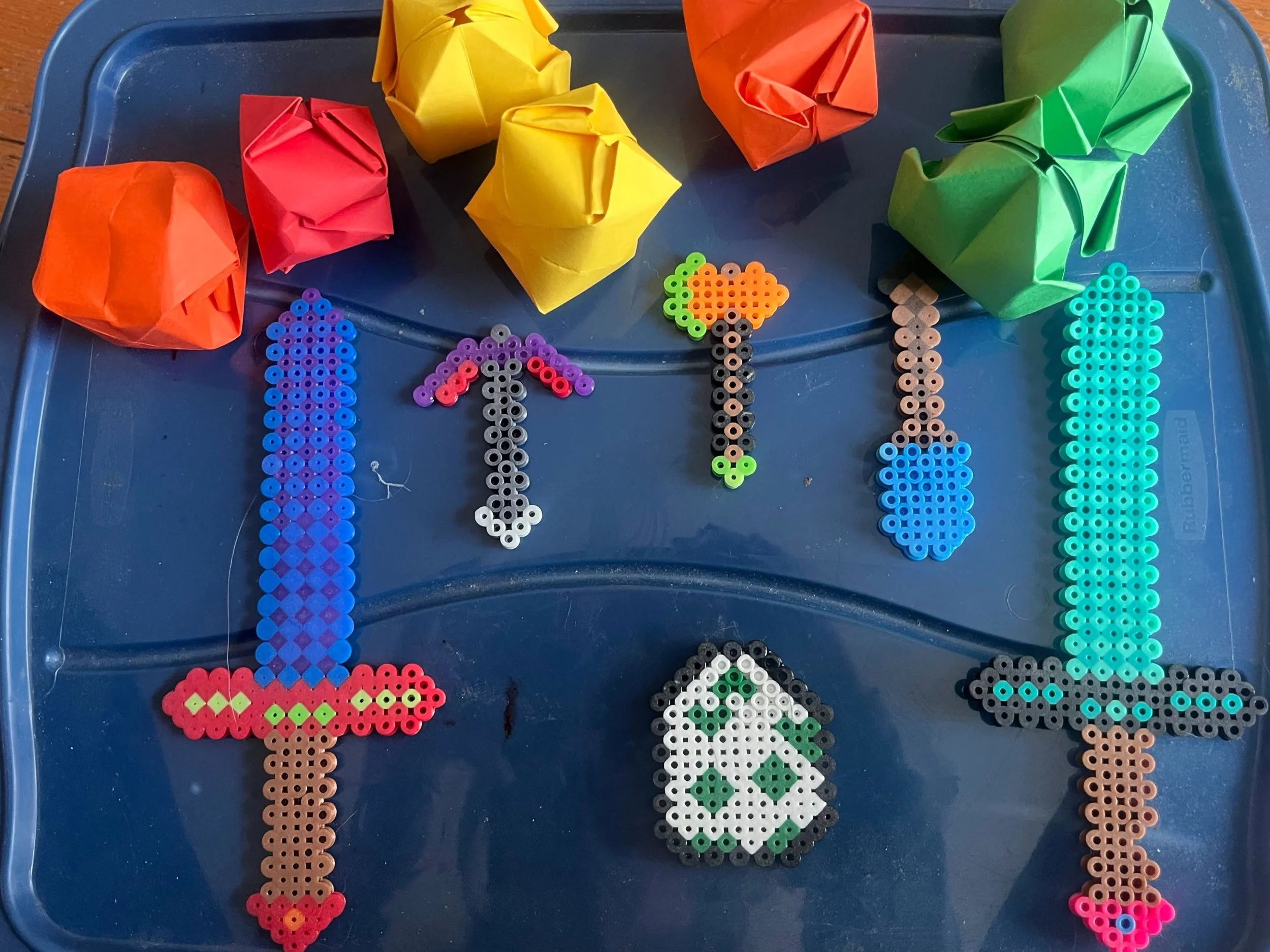 The Crafts Can Be Used In Active Games: We made an entire afternoon’s fun in the form of a Minecraft Item Scavenger Hunt! The kids had to follow clues, do mini games, and complete an obstacle course to get their proper Minecraft tools and weapons. At the end, even the PRIZE they earned for solving all the riddles was an egg made from Perler beads! It took a lot of planning and crafting, but I got to do something special with the kids and it didn’t cost anything more than the craft pieces I already had.
